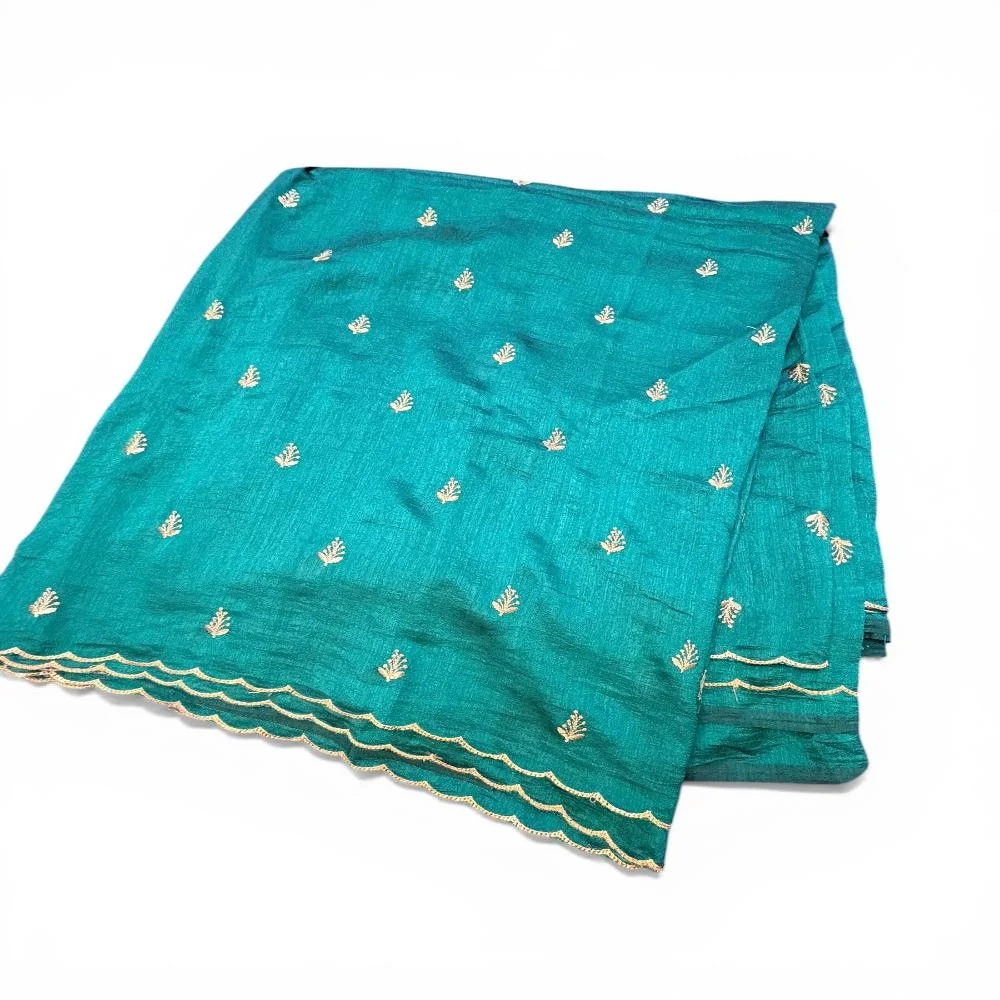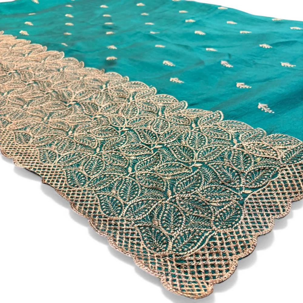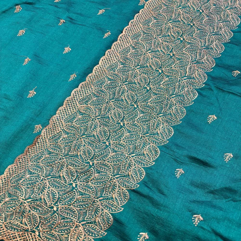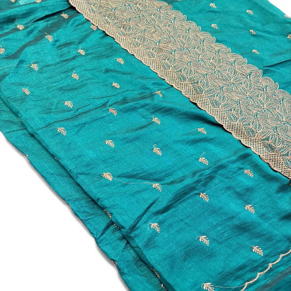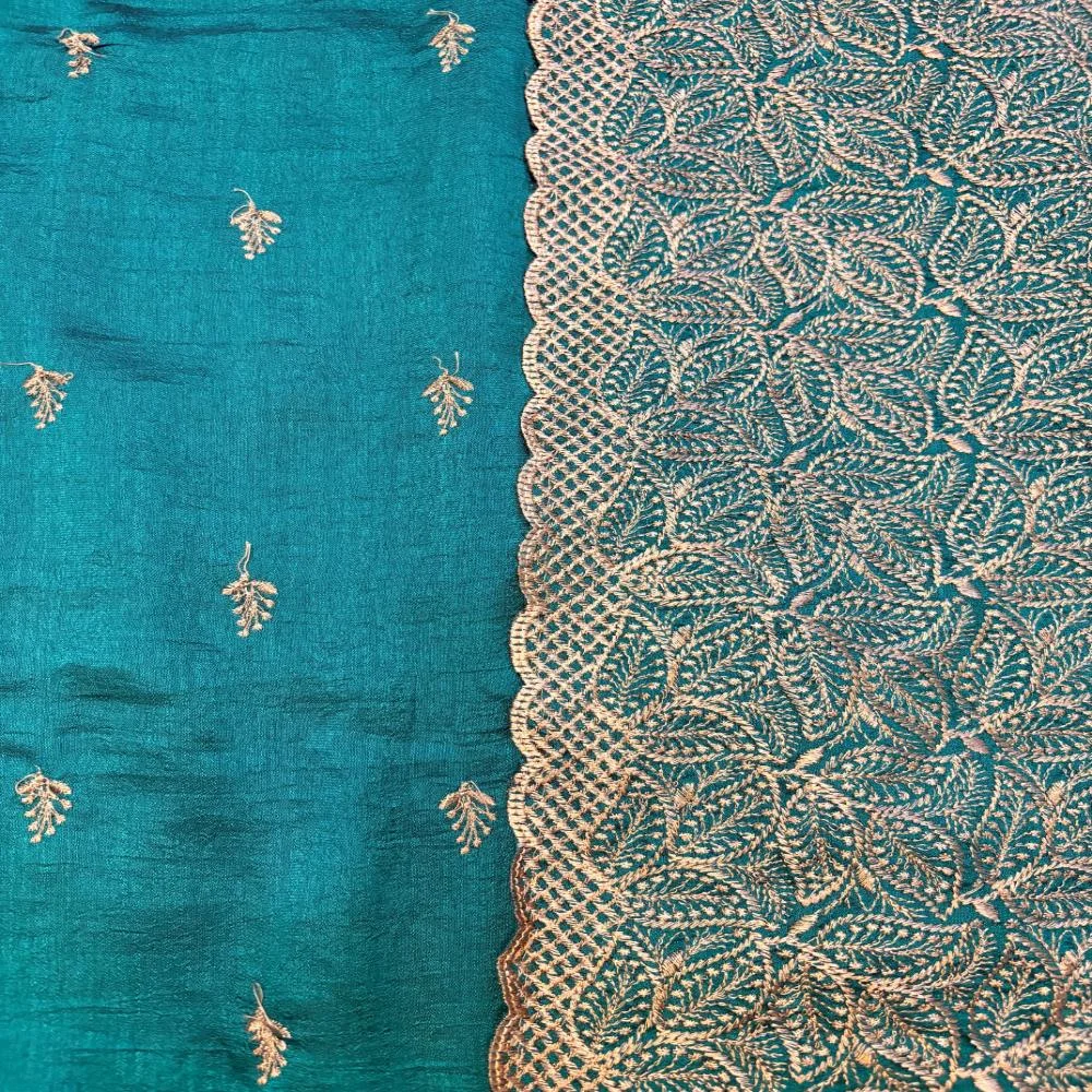 A unique Dark Green + Cream saree crafted in semi tissue silk for a sophisticated and elegant look.