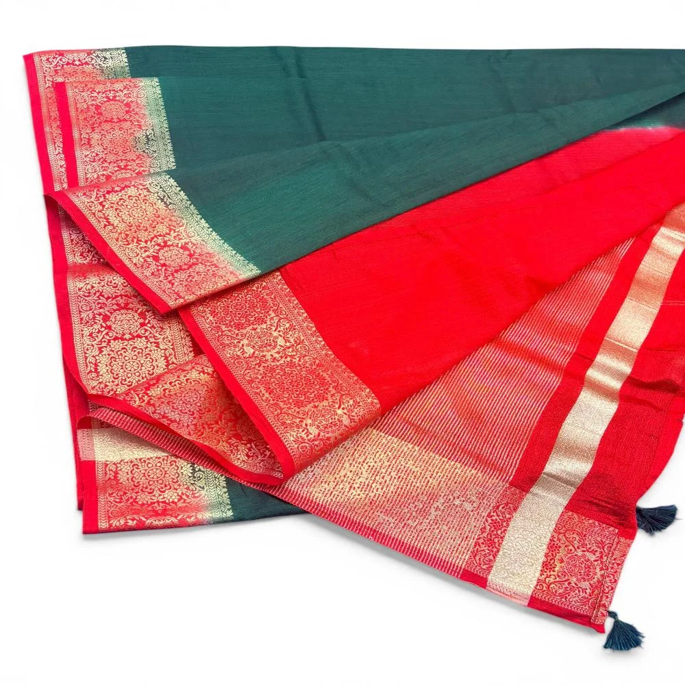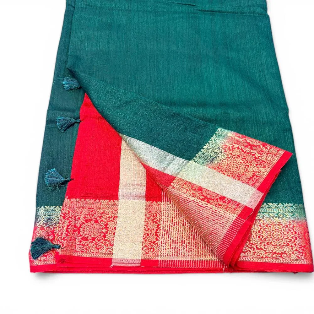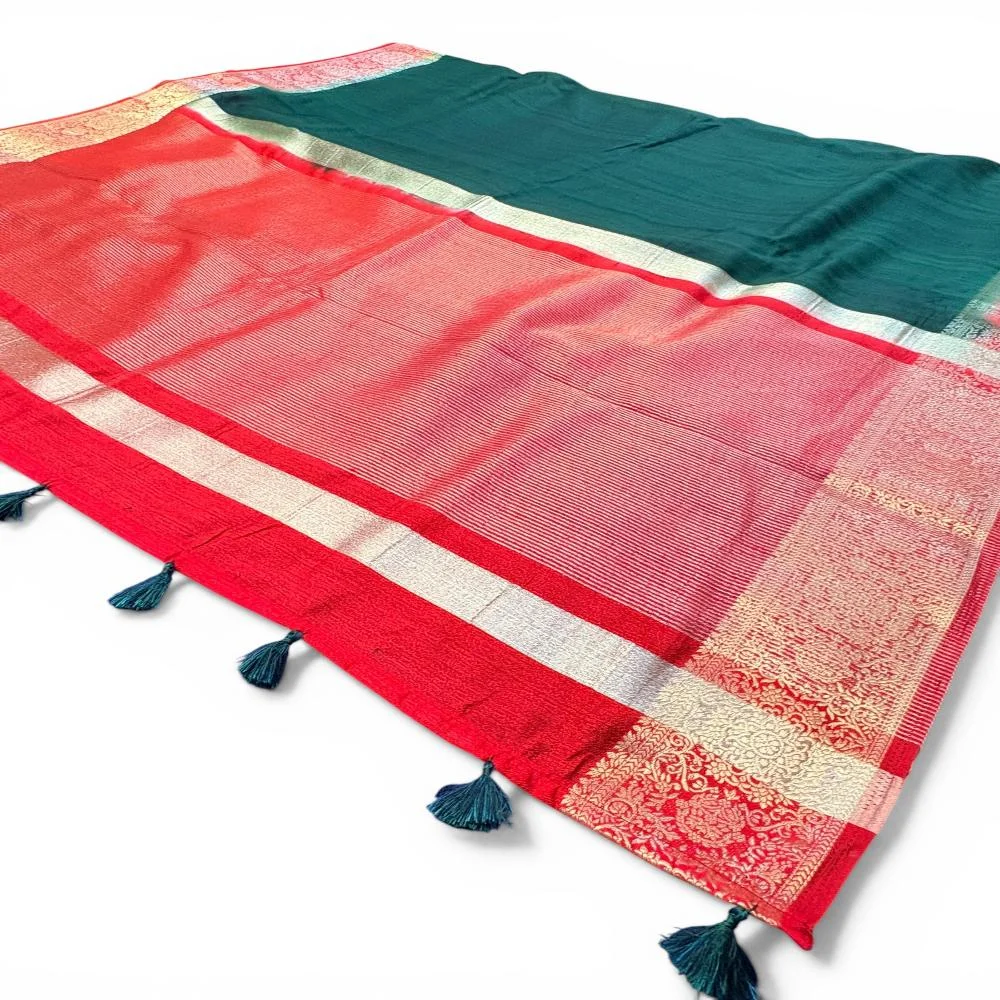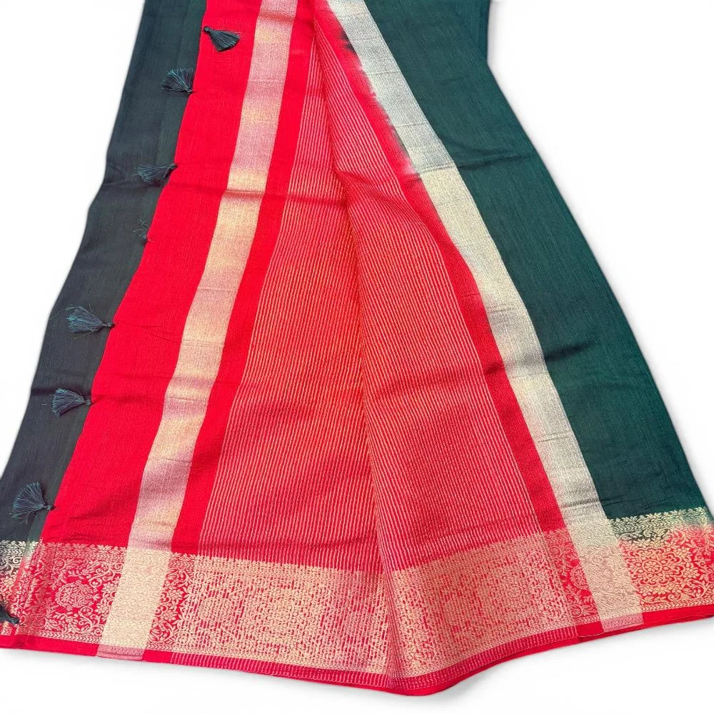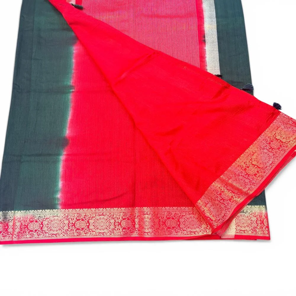 A stunning Green + Red saree made from rich Tussar silk, offering a perfect blend of tradition and elegance.