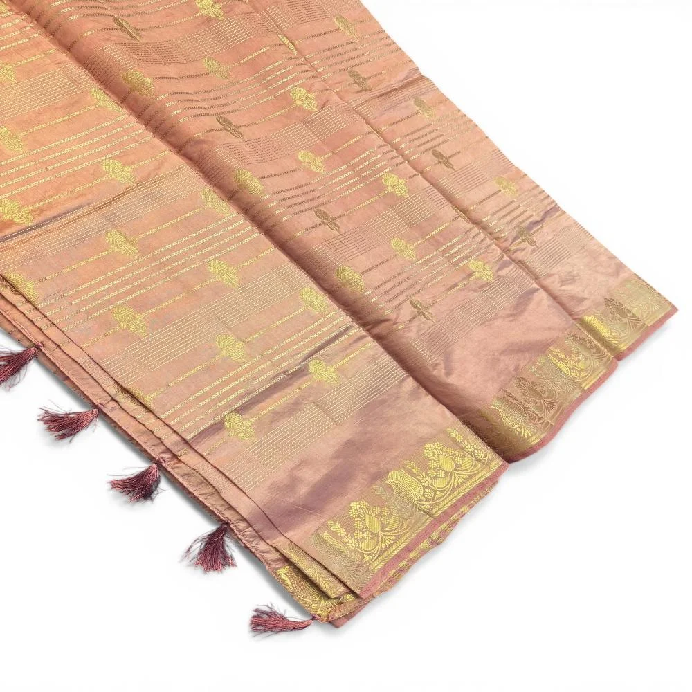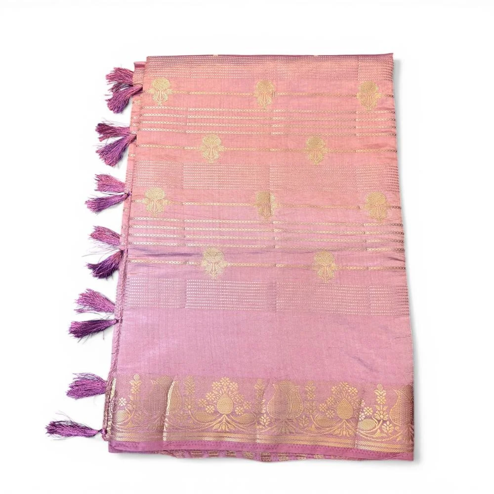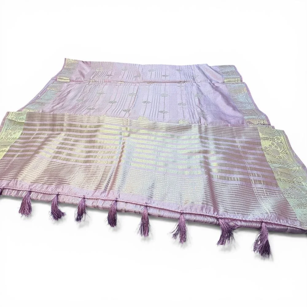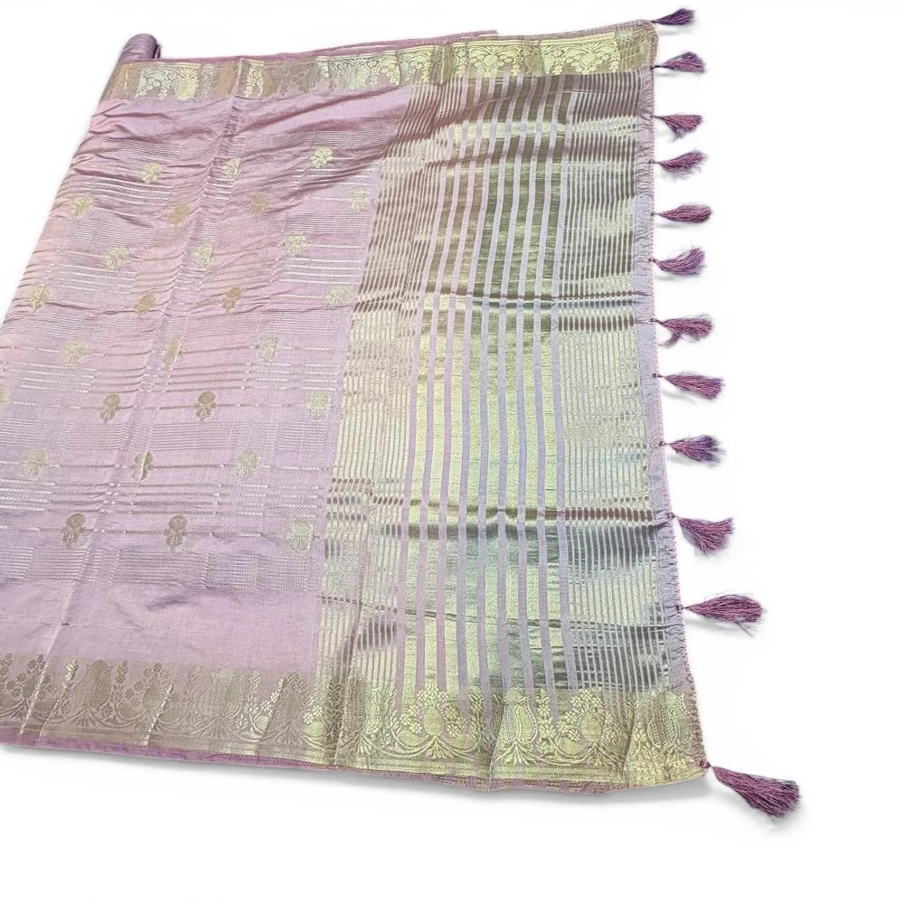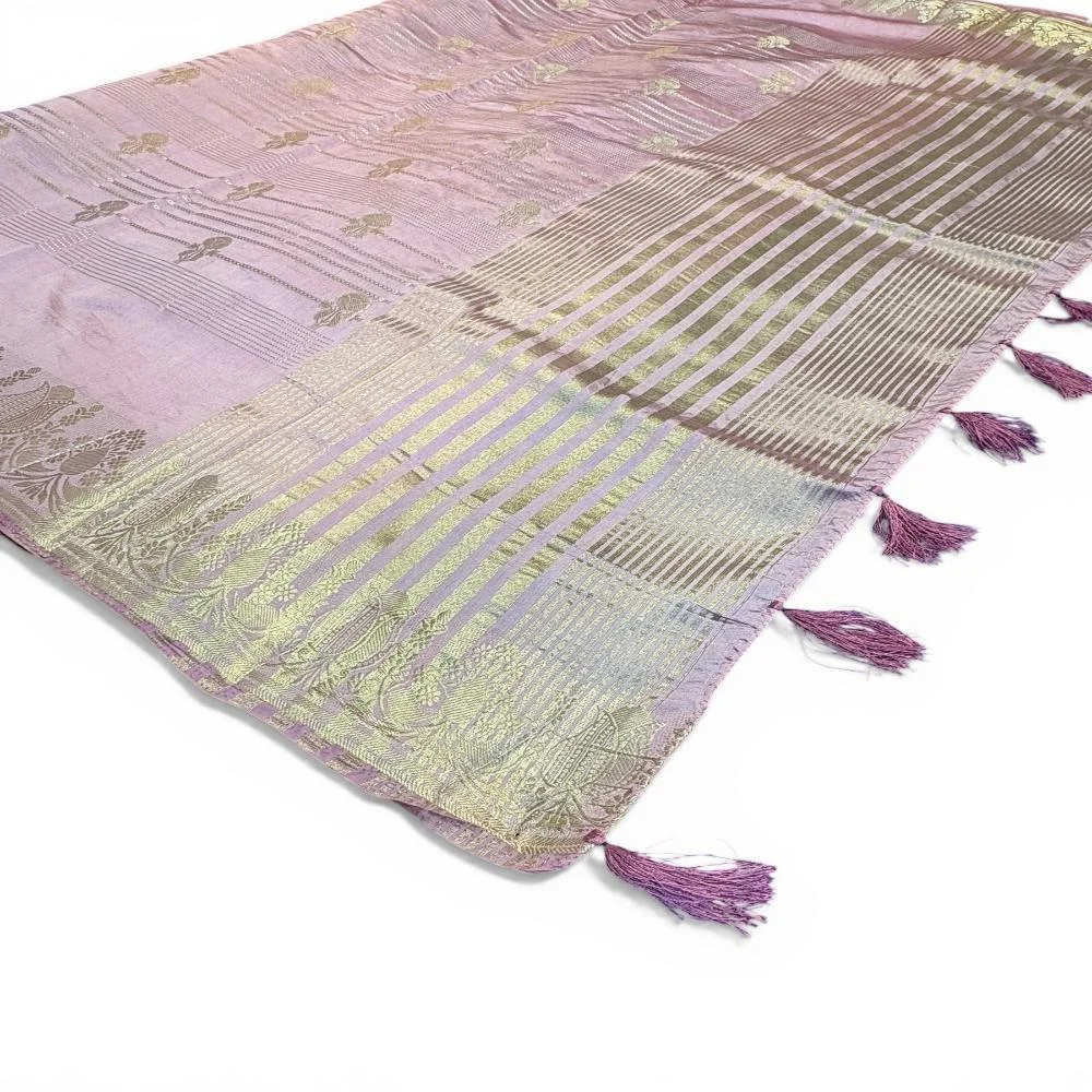 A graceful Lilac Gold saree made from soft silk, offering a rich and smooth drape.